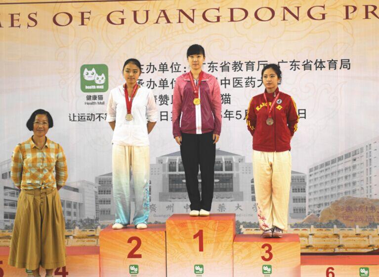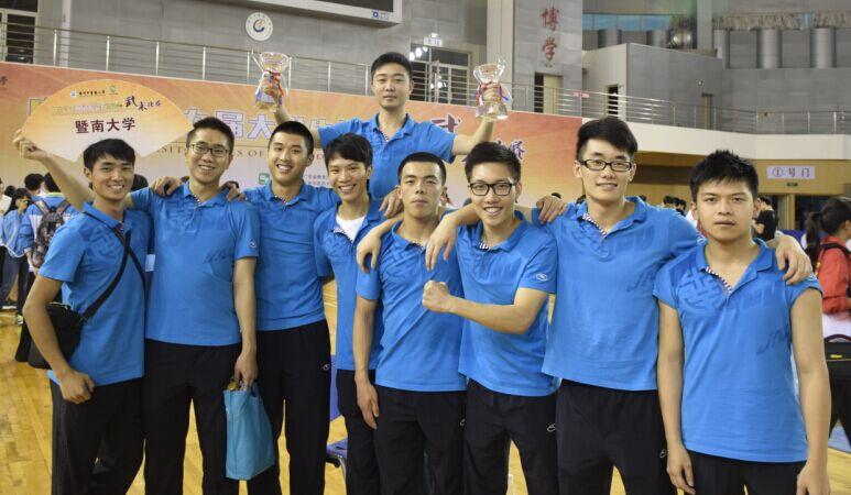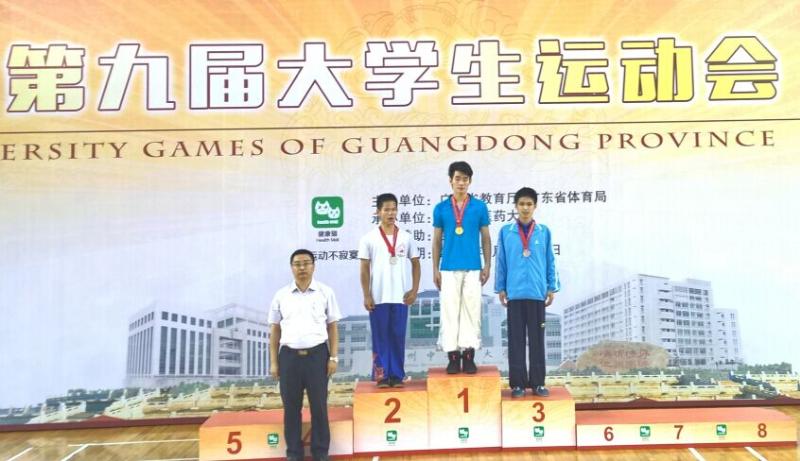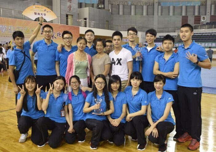 2015年5月11日,经过4天激烈的争夺战,广东省第九届大学生运动会武术比赛在广州中医药大学圆满结束。由体育部甘雷老师带队,我校16名选手因娴熟的动作、高超的技术给评委和观众留下了深刻的影响,夺得了3金5银6铜,并获得乙B组团体总分第二名及甲组团体总分第六名的优异成绩。5月9日下午,林永浩在男子甲组自选刀术比赛中凭借其精炼的刀法,动作舒展大方,尽力十足,为我校夺得首枚金牌。男子甲组选手李骁晋也在枪术比赛中获得冠军。女子乙B组选手刘晓东在自选太极拳比赛中力压群芳,伴随着时而激昂时而温婉的音乐,行云流水般,身法轻盈却又步伐稳健,动作飘逸却不失刚劲,凭借其多年比赛经验,调整心态,成功完成跳跃难度,为暨大再添一金。刘百龙、罗佩欣、黄天沛等队员在比赛中发挥稳定,表现出色,被大会授予道德风尚奖。