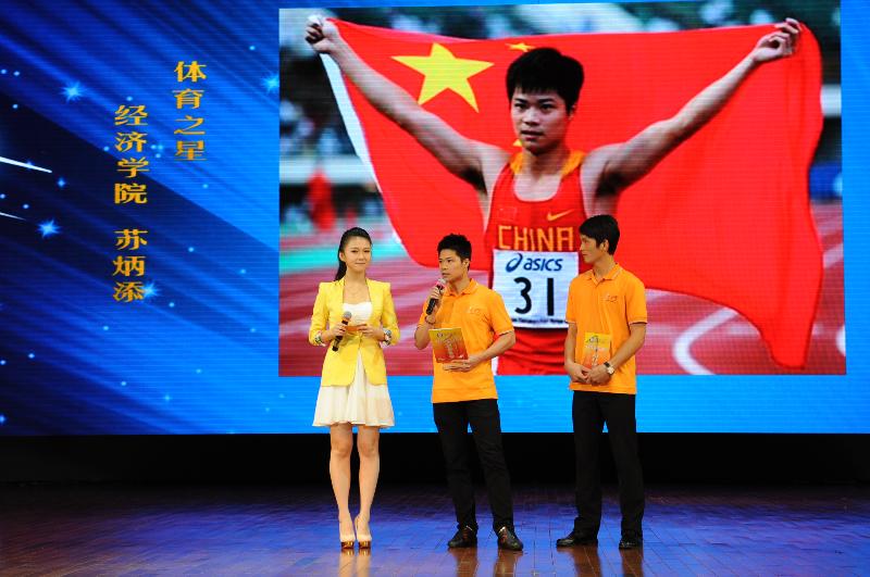 苏炳添1989年8月29日出生于广东省中山市,2009年入读经济学院国际经济与贸易专业本科,现为经济学院国际经济与贸易研究生二年级学生。作为暨南大学的学生,苏炳添既是竞技赛场上的冠军,也不忘作为学生的本职,在训练期间,他克服早起训练带来的困倦,坚持上课,做好笔记,凭借着顽强毅力刻苦求知,使比赛与学习齐头并进。2012年荣获“2011中国大学生年度人物”,2013年被评为我校卓越引领计划首届“体育之星”,并曾多次代表学院参加校运会和代表学校参加大学生田径锦标赛。