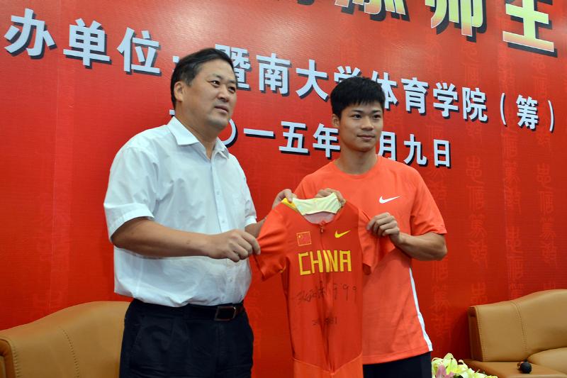胡军在致辞中表示,苏炳添同学在2015年国际田联钻石联赛美国尤金站男子100米赛中取得9.99秒的成绩,成为历史上首位突破10秒大关的亚洲本土选手,这不仅刷新了中国田径百米跑的记录,实现了几代田径人突破10秒大关的夙愿,也延续了暨南大学的优良体育传统,为母校赢得了荣誉。他还专门提到,苏炳添在赛后做客央视《风云会》时,不忘母校,身穿印有母校logo的服装接受采访,这充分表明了苏炳添同学的拳拳爱校之心。胡军校长希望苏炳添能够再接再厉,不断取得新的突破,为母校添彩,为国家争光。同时,他还提议,“欢迎苏炳添明年研究生毕业后继续读暨大博士,那一定是世界上跑得最快的博士。”