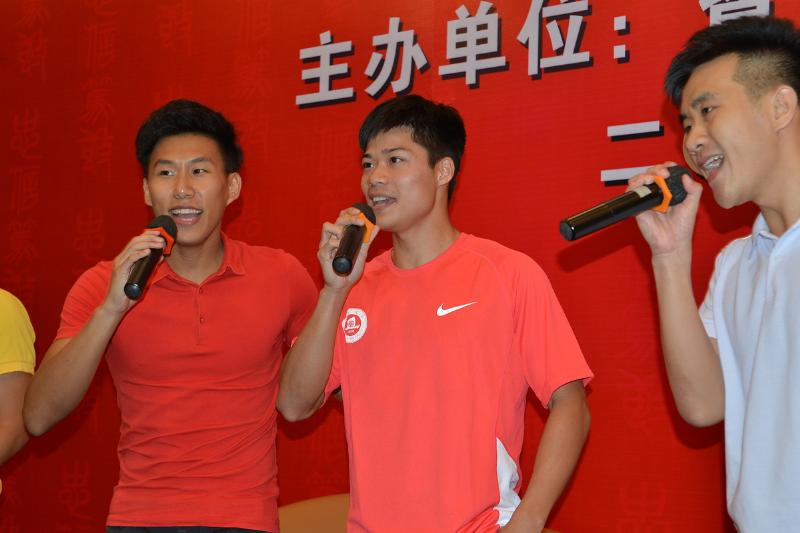 (苏炳添与学校艺术团的同学倾情合唱《飞得更高》)