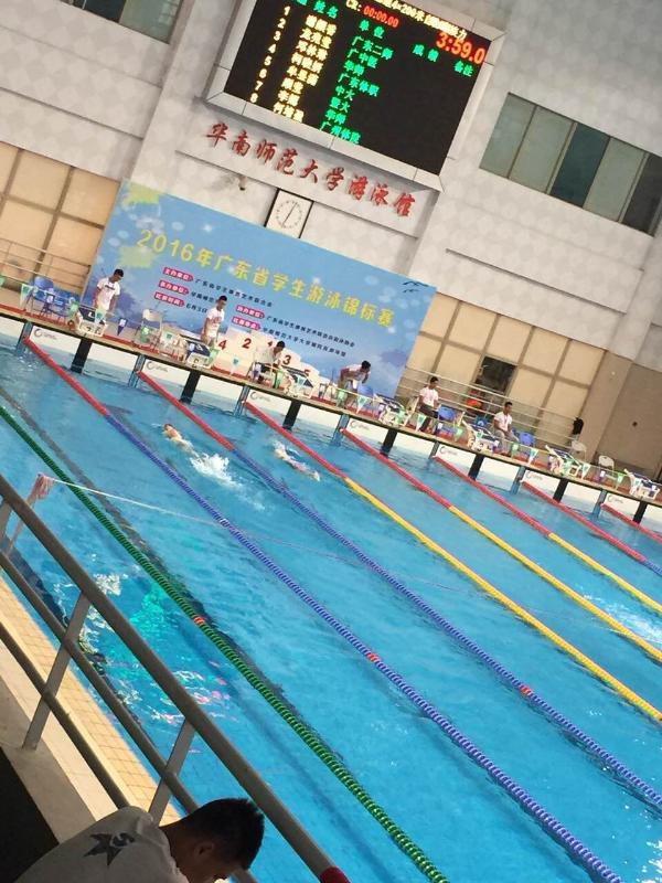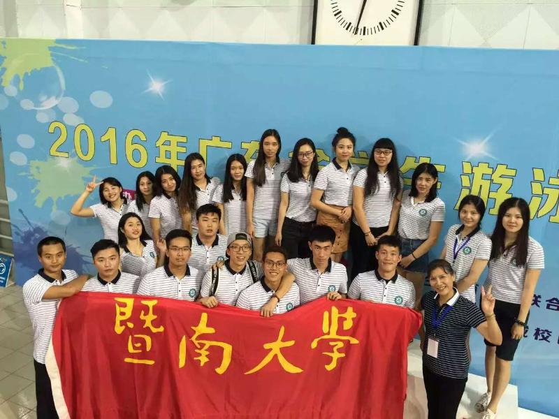 2016年6月3-5日,由广东省高教厅体卫艺处和学生体育联合会主办的“2016年广东大学生游泳锦标赛”在华南师范大学大学城游泳馆举行,全省共有41所大学,646名运动员和教练员参赛,我校派出由13人组成的游泳男队参赛,获得9金6银3铜,甲组团体总分亚军,乙B组获得团体总分第四。
