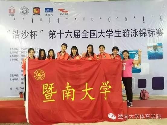 2016年7月17日至20日在内蒙古鄂尔多斯市举行了全国大学生游泳锦标赛,来自全国58所高等院校,共498名运动员经过了为期四天紧张激烈的拼搏,取得了可喜的成绩,尤其是我们暨南大学在领队岳文言,教练龙明教授的带领下,8名女运动员敢于挑战自己,克服天气干燥,海拔高,身体状况不适应等不良反应,取得了三枚银牌的好成绩,她们是2015级体育教育专业顾莹同学,获得女子丙组200米蝶泳银牌,2015级国经贸专业的陈诗铭获得丙组50米仰泳,100米仰泳两块银牌。