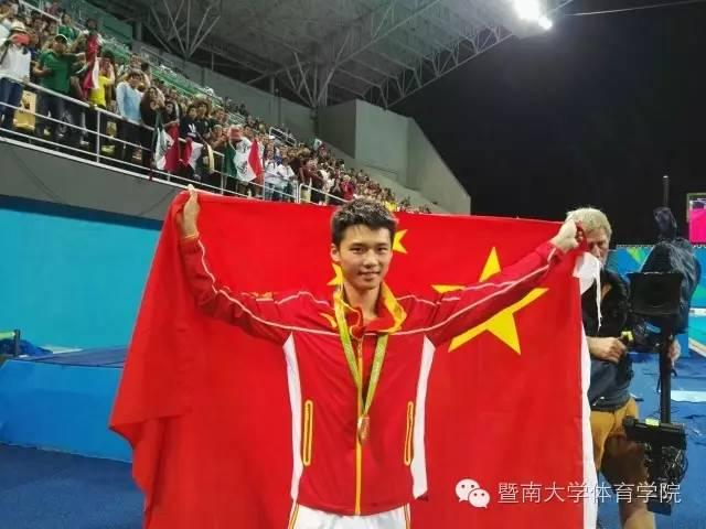陈艾森同学获男子单人十米跳台和双人十米跳台两个项目的金牌,成就“双冠王”,这是暨南大学奥运会上的首金。