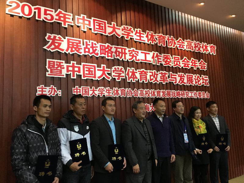 1129,由首都体育学院作为理事长单位主持召开的2015年中国大学生体育协会高校体育发展战略研究工作委员会年会暨中国大学体育改革与发展论坛在上海大学成功召开。来自包括暨南大学在内的全国各地近50多个理事单位的近80名专家、学者和相关领导济济一堂,共商中国大学体育改革与发展大计。国际大学生体育联合会副主席、中国大体协秘书长、大体协执行副主席王刚以及首都体育学院钟秉枢校长(理事长)、王凯珍副校长(副理事长)等出席了本次年会。本次会议对中国大学生体育协会高校体育发展战略发展研究工作委员会理事进行了增选,暨南大学体育学院副院长(主持工作)徐泽教授(左二)参加了该次年会并获聘为该委员会新一任理事。