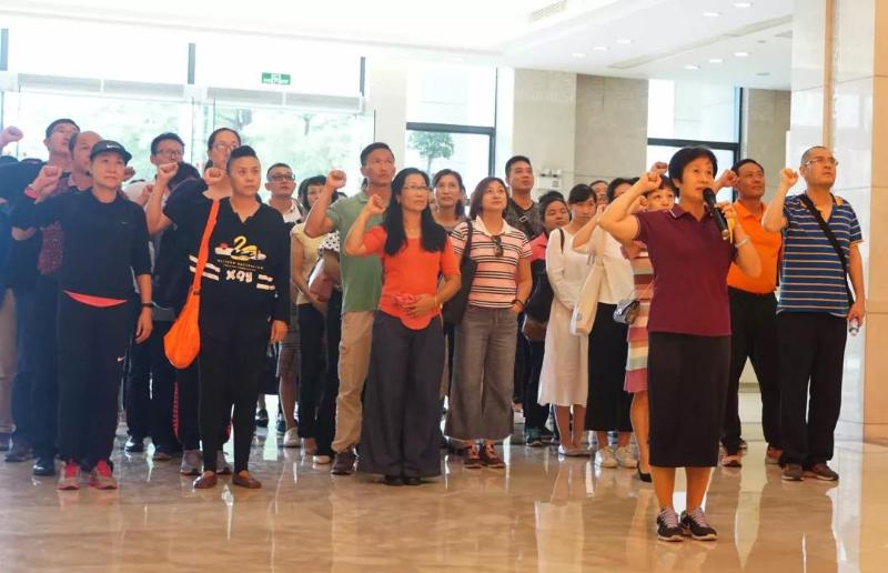 “我志愿加入中国共产党......”参加学习的教职工在中共唯品学院党总支李淑芬书记的带领下,面对党旗举起右手,重温入党誓词。铿锵有力的宣誓声回荡在会场,表达了大家牢记誓言,不忘初心,忠诚履职尽责的信心与决心。