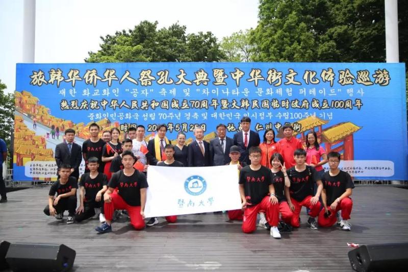 应韩华中国和平统一促进联合总会、中国在韩侨民协会总会邀请,我校学生处区向丽处长率领暨南大学中华才艺(武术·龙狮)培训基地龙狮队一行18人,于2019年5月21日至25日赴韩国展开为期5天的交流访问。体育学院潘冬、章舜娇老师及6名体育教育本科专业学生(15级:李华升、林钊龙;16级:耿天海;17级:Ong Yen Chang、史亚超;18级:陈思帆)作为龙狮交流团成员参加了此次出访交流活动。
