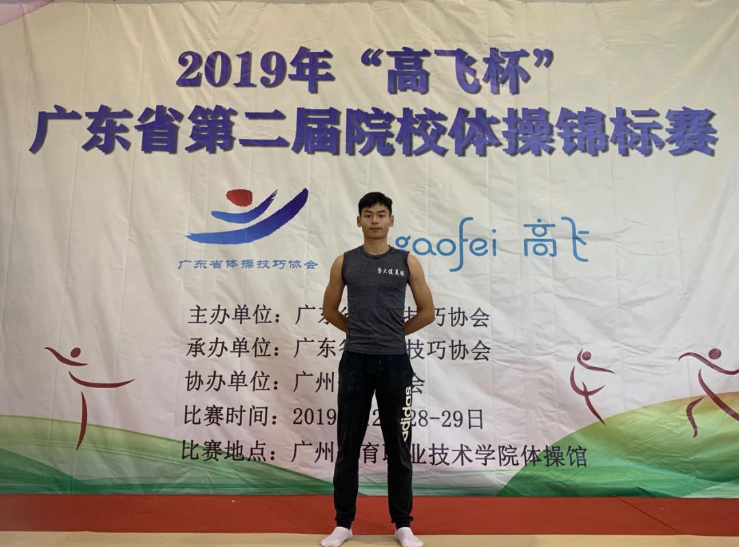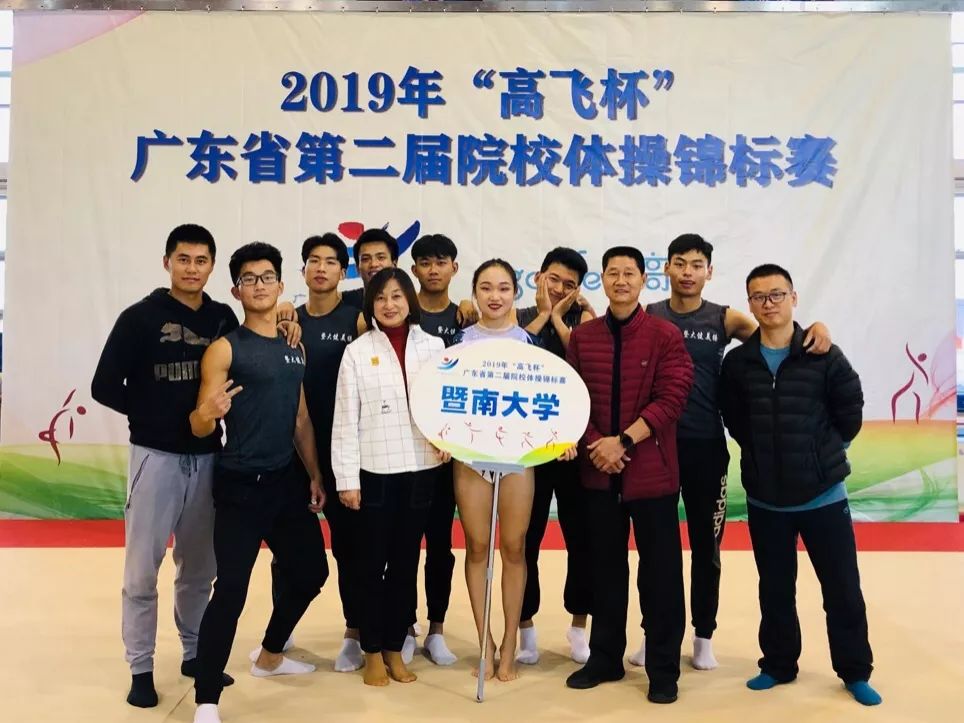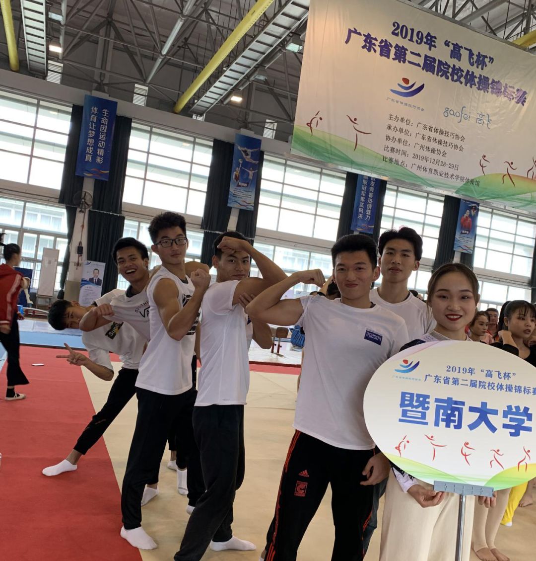 2019年12月28日-29日,暨南大学体操队在刘上行副院长带队下,段晓莉、陈义龙、曾泳三位老师的指导下,首次参加了广东省院校体操锦标赛。经过一个多月的刻苦训练和赛场上的顽强拼搏,队员们赛出了暨大体育人的风采。最终,暨大体操队取得了3金、1铜、1项第六名、1项第七名的个人优异成绩;在团体总分上获得了男子甲组二级团体第三名和男子甲组三级团体第三名。