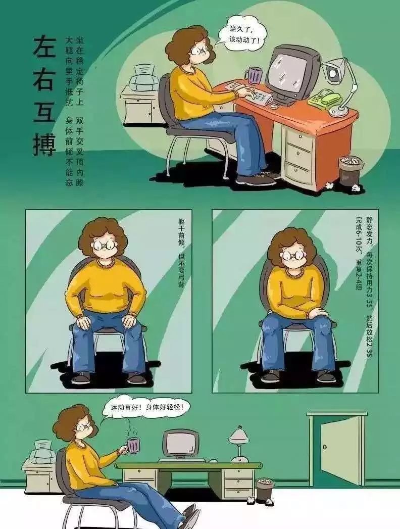 口诀:坐在稳定椅子上,双手交叉顶内膝,大腿向里手抵抗,身体前倾不能忘。