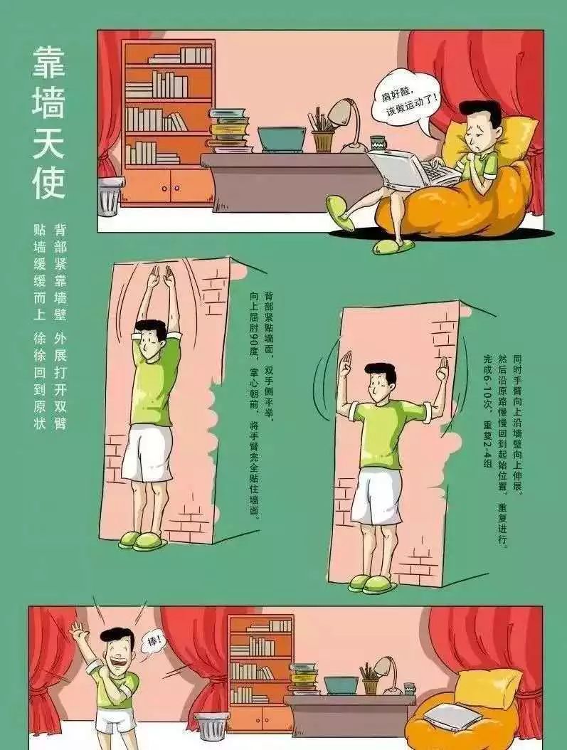 口诀:背部紧靠墙壁,外展打开双臂,贴墙缓缓而上,徐徐回到原状。