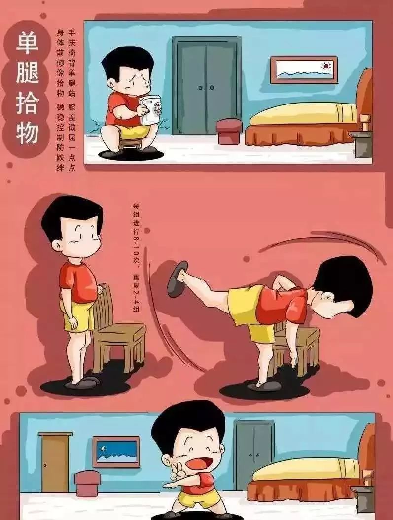 口诀:手扶椅背单腿站,膝盖微屈一点点,身体前倾像拾物,稳稳控制防跌绊。