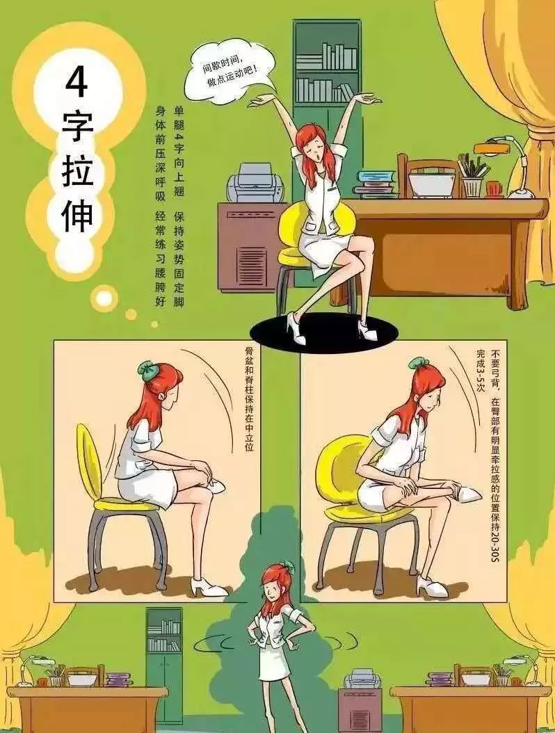 口诀:单腿4字往上翘,保持姿势固定脚,身体前压深呼吸,经常练习腰胯好。