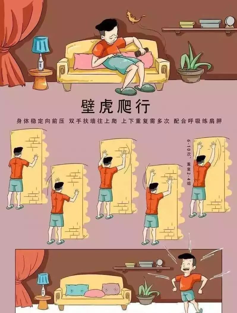 口诀:身体稳定向前压,双手扶墙往上爬,上下重复需多次,配合呼吸练肩胛。