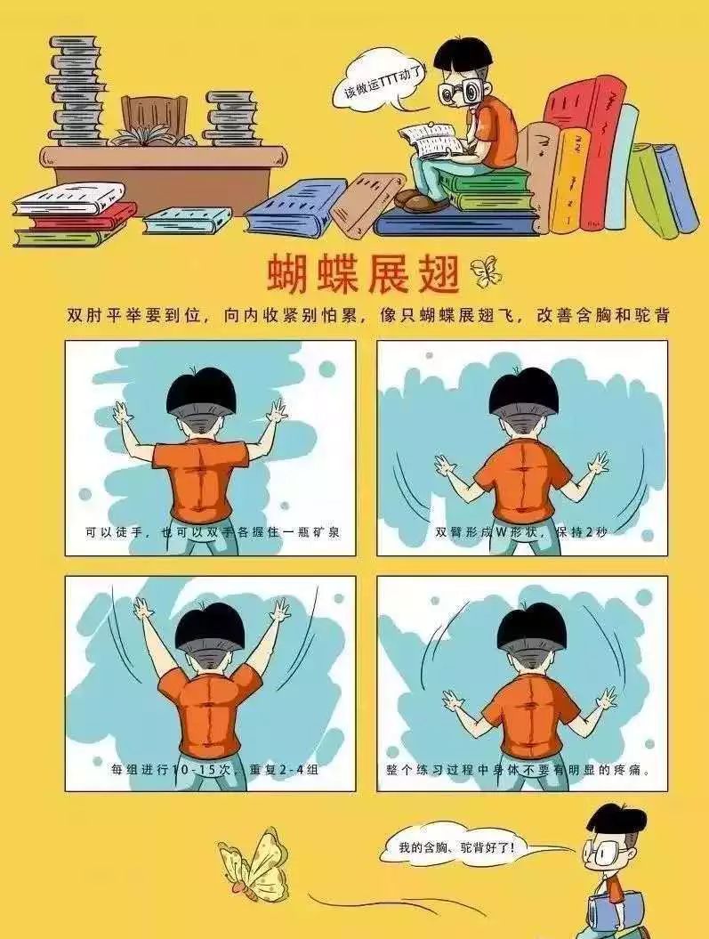 口诀:双肘平举要到位,向内收紧别怕累,像只蝴蝶展翅飞,改善含胸和驼背。