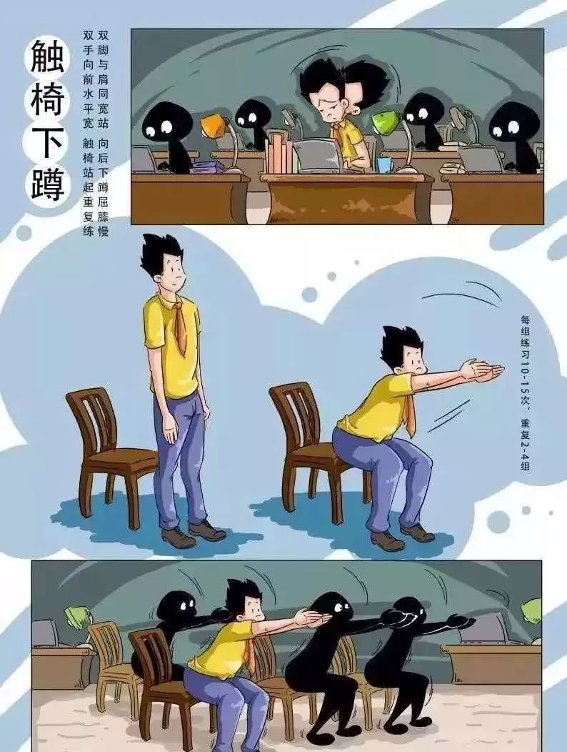 口诀:双脚与肩同宽站,向后下蹲屈膝慢,双手向前水平伸,触椅站立重复练。