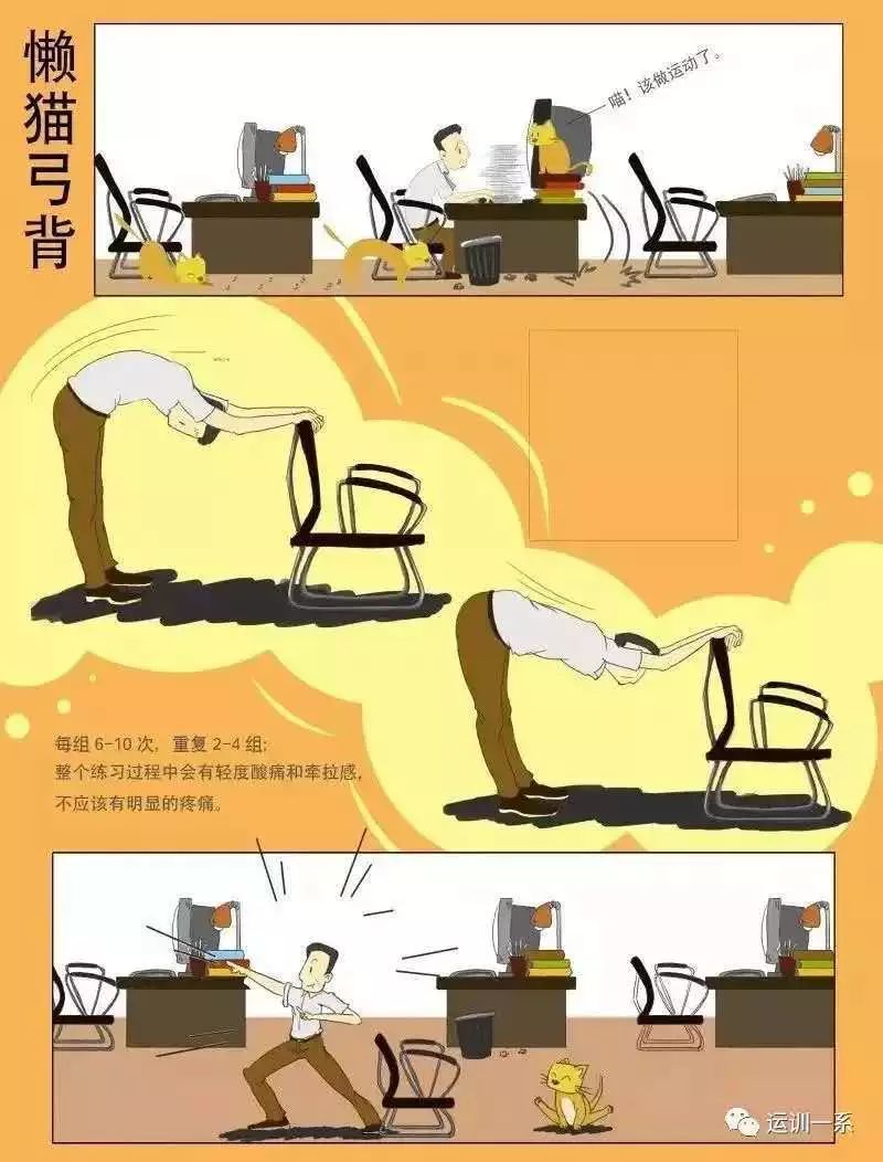 口诀:手扶椅背弓弓背,拉抻脊柱背不累,像只猫咪伸懒腰,肩背放松不疲惫。