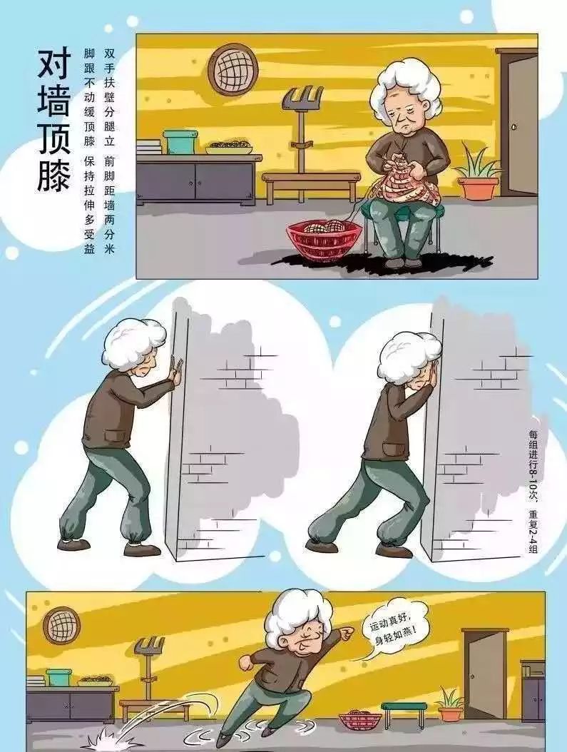 口诀:双手扶壁分腿立,前脚距墙两分米,脚跟不动缓顶膝,保持拉伸多受益。