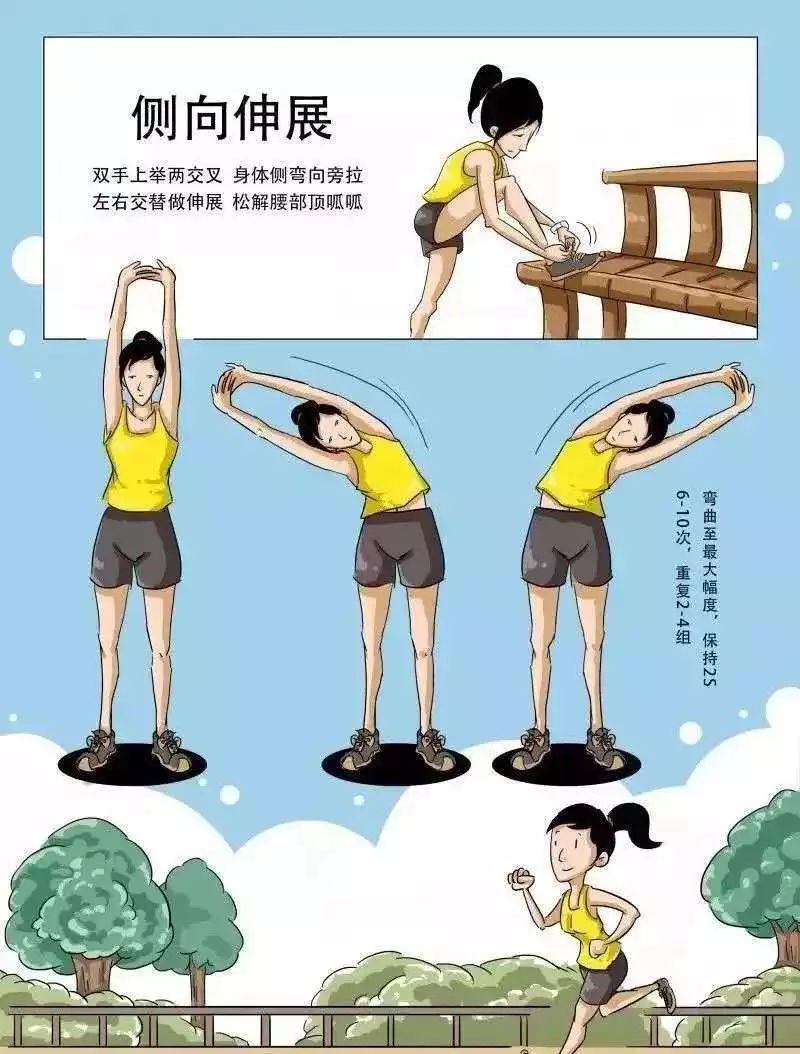 口诀:双手上举两交叉,身体侧弯向旁拉,左右交替做伸展,松解腰部顶呱呱。