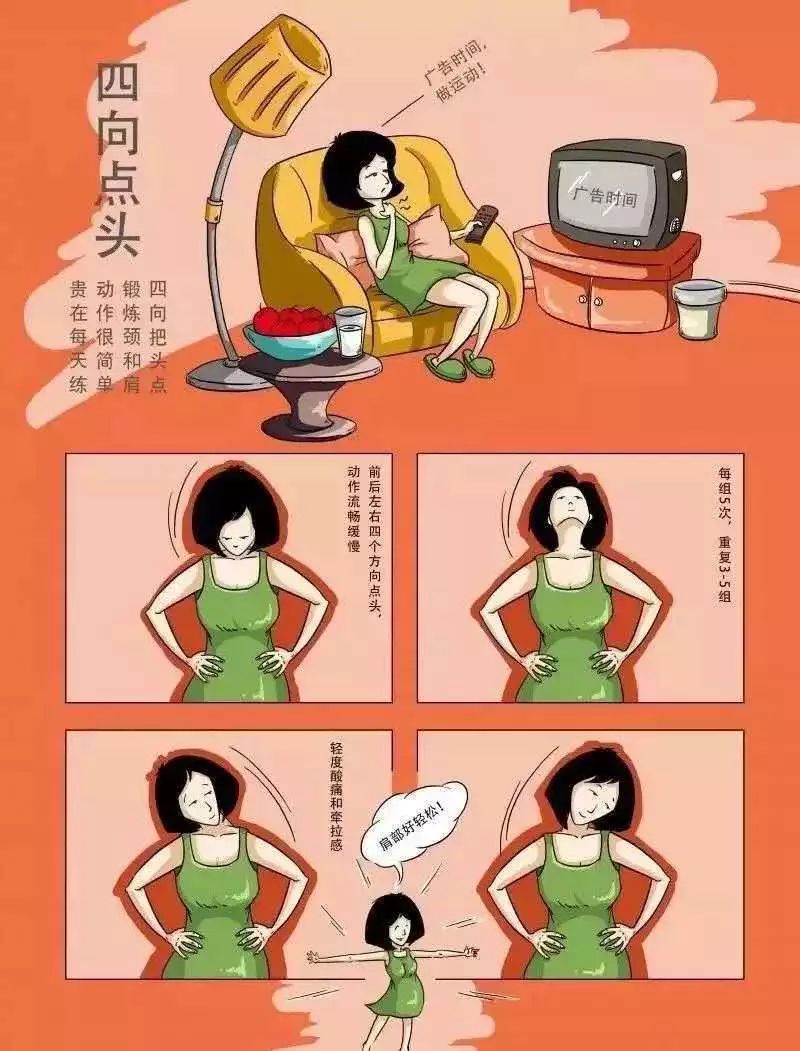 口诀:四向把头点,锻炼颈和肩,动作很简单,贵在每天练。