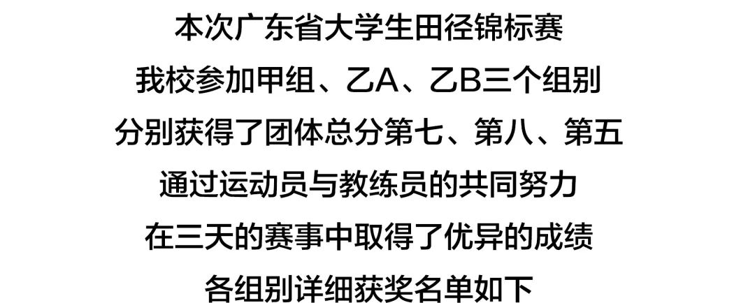 在本次比赛中由田径队麦雪萍、邓民威、李春林、潘民、郑中中教练带领的运动员们发挥出色,在赛场上通过激烈的拼搏,三日共8金14银2铜的优异成绩斩获本次大赛的甲组第七名、乙A组第八名、乙B组第五名。