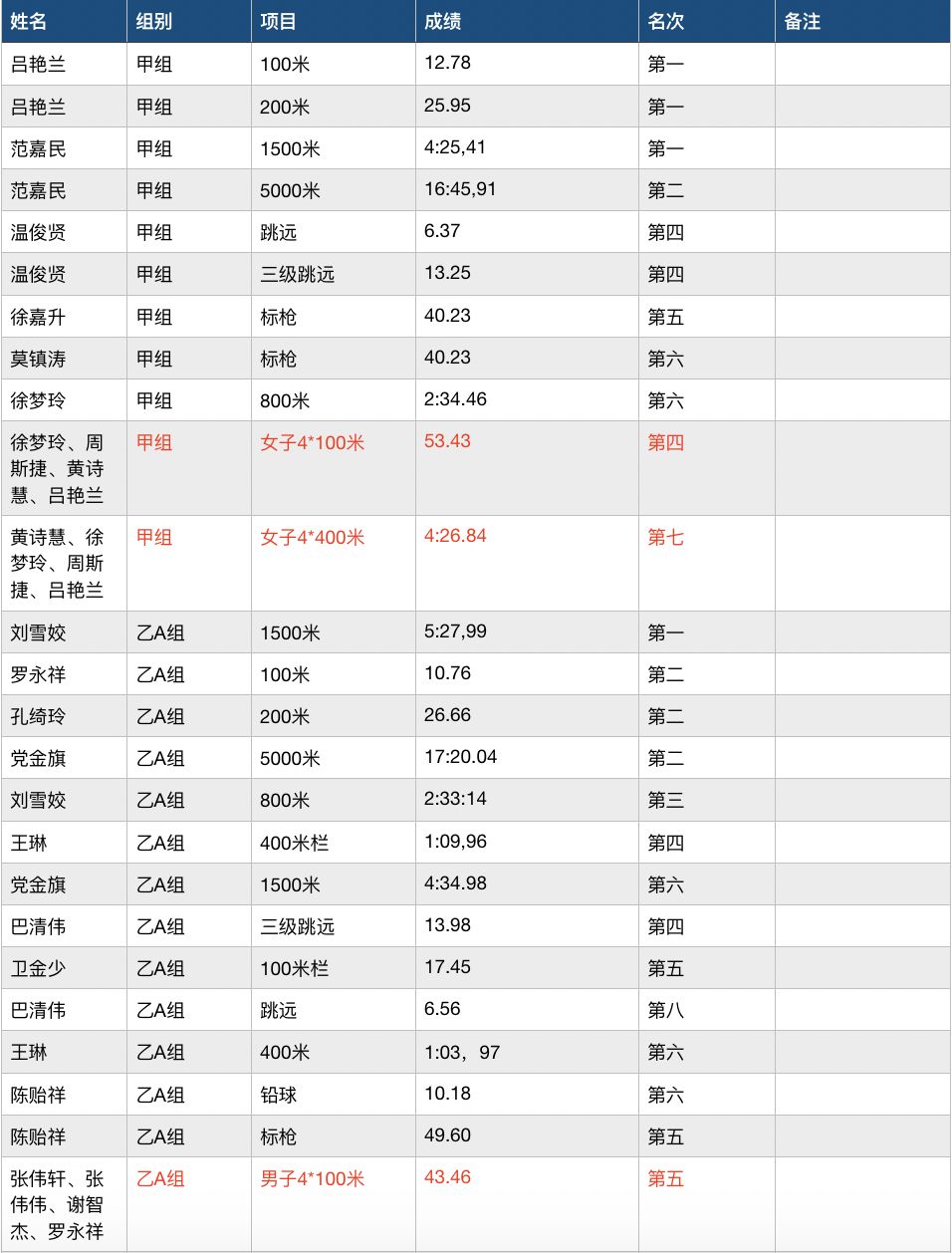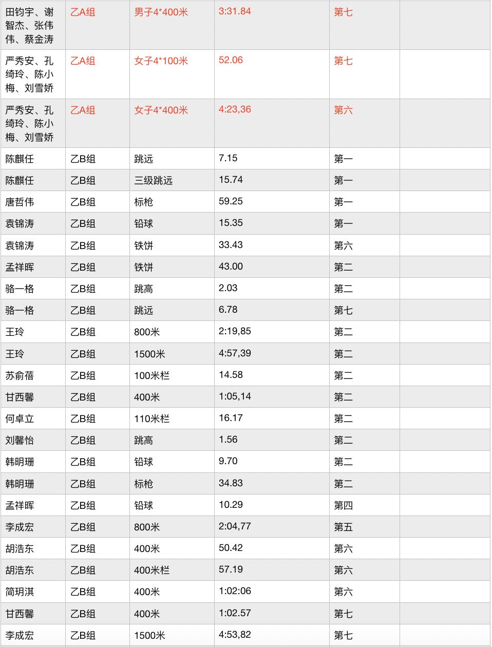 乙A组男子4*100接力赛获第五