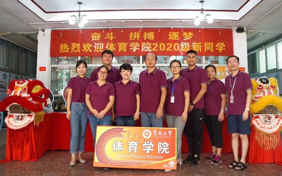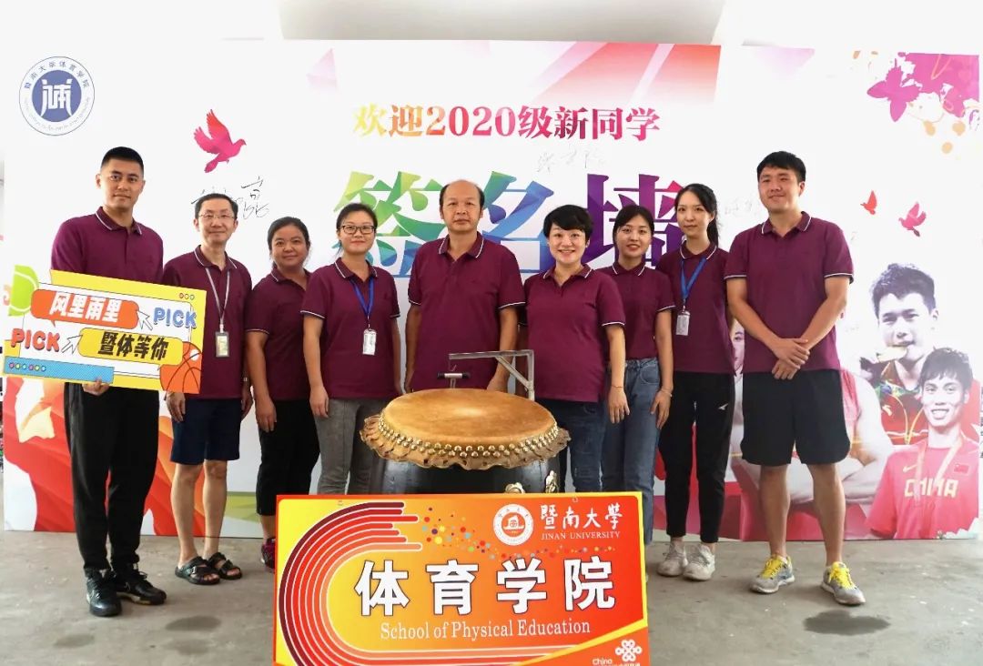 体育学院彭国雄院长(中)、杨卫卫副书记(左四)与参加迎新工作的教职工合影