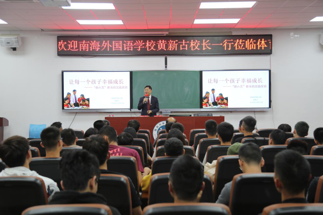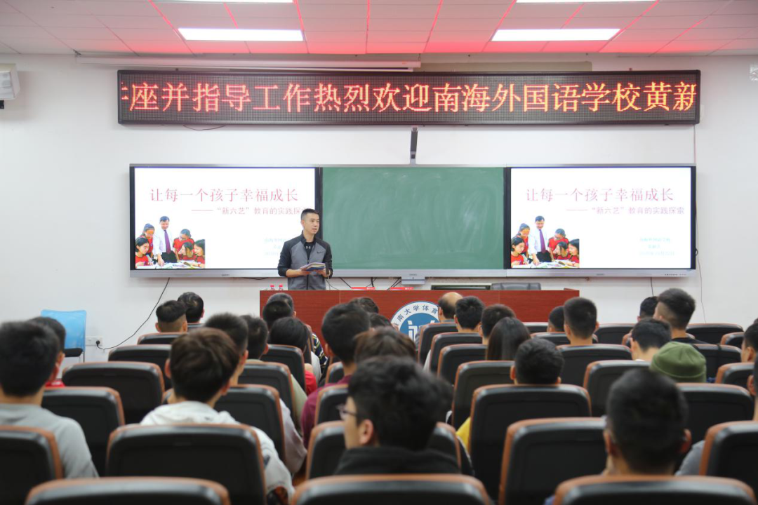 座谈会后,体育学院潘冬副院长组织并主持了黄新古校长、刘敏聪副局长的前沿讲座,体育学院全体学生及部分专任教师到场聆听。黄新古校长以南海外国语“新六艺”教育的实践探索为题,全面介绍了南海外国语学校的教育理念与发展成就,分享了教育部名校长领航工程黄新古工作室四川凉山支教经历,诠释了一个理想主义教育家的精神追求与践行。