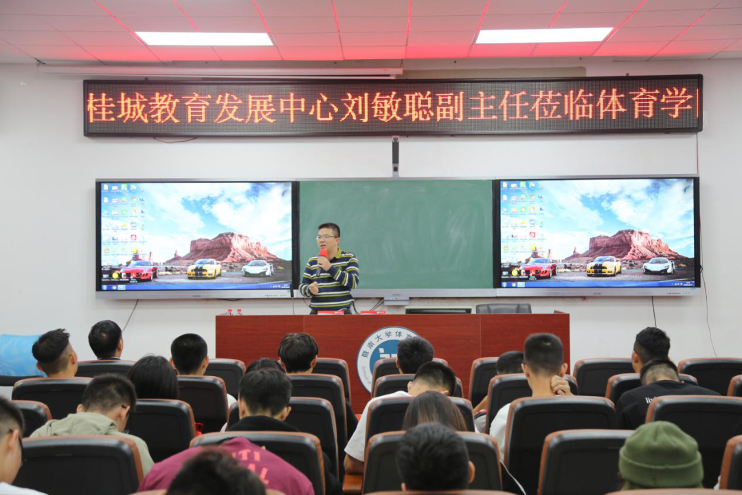 刘敏聪副局长专门向师生介绍了南海区桂城教育的发展历程,用一项项成果证明了“佛山教育看南海、南海教育看桂城”的坊间口碑,并结合“体育中考计分等持平语、数、外主科”的国家政策勉励在座所有体育教育专业学生刻苦学习、扎实训练,不断内修实现体育教育专业的“专业自信”。