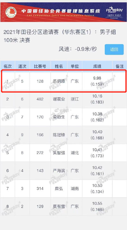4月24日下午,2021田径分区邀请赛(华东赛区),男子100米决赛,我院苏炳添副教授跑出9.98秒(-0.9m/s)强势夺冠,该成绩排名赛季亚洲第一位,世界第五位。这是他自2018年之后再次打开10秒大关,重新刷新个人最佳成绩,同时也打破了赛会成绩。