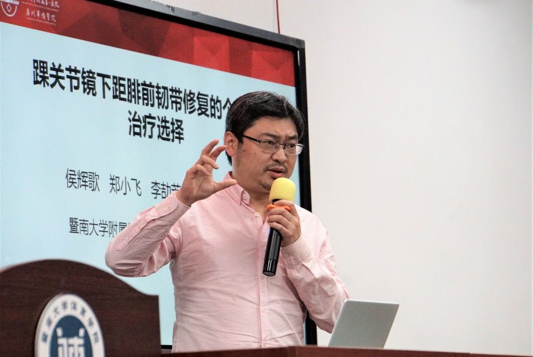 讲座的下半部分“踝关节扭伤的个体化治疗方案选择”由侯辉歌医生进行分享。侯医生为在场师生分享了关于踝关节扭伤的“POLICE原则”,并结合多年研究分享了他个人关于伸肌下支持带增强术相关问题的探讨,同时表示全镜下关节内ATFL修复+生物加强术值得期待。