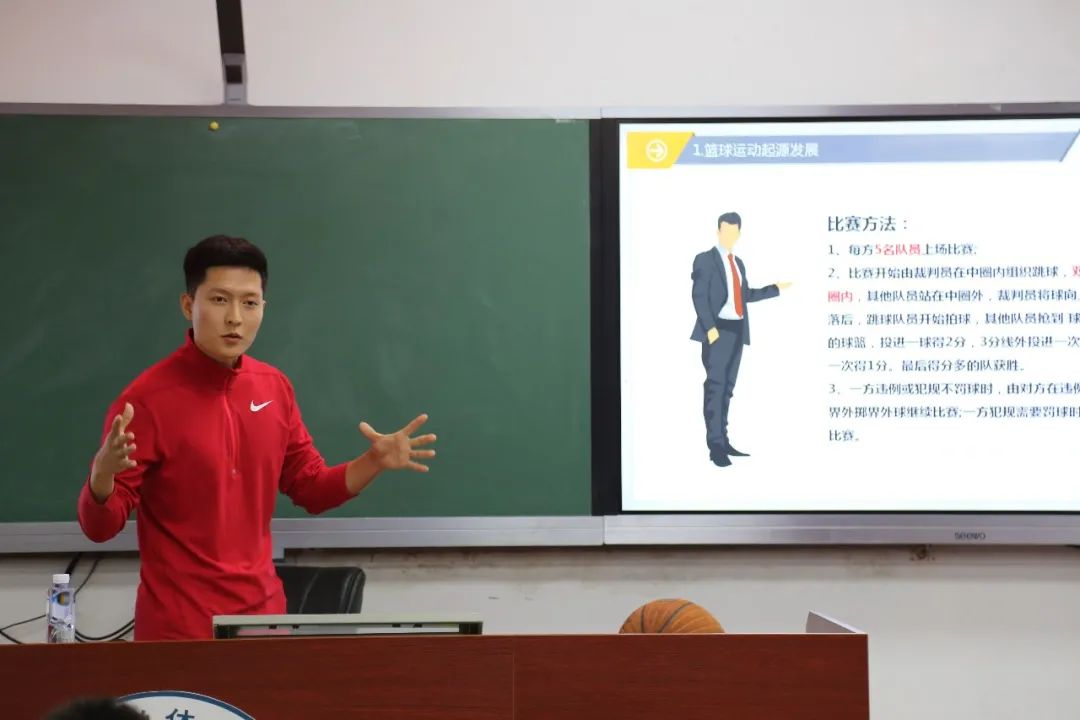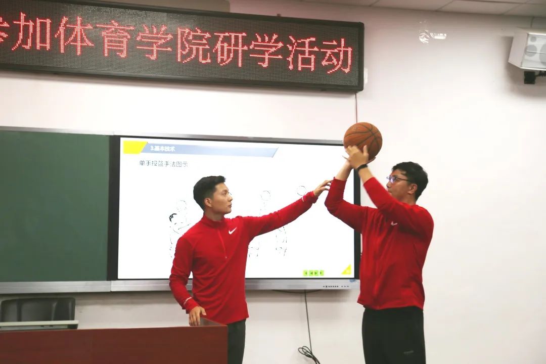 4月28日,第二次研学活动在体育学院多媒体电教室举行,本次研学课程由岳亮、杨晓铮主讲篮球专项理论知识。两位老师从篮球运动的起源与发展谈起,介绍了篮球场地规格及比赛规则,并现场演示、教授篮球运动的移动技术、传接球技术、投篮技术、运球技术、持球突破技术、防守技术等。课程最后,老师们与在场同学共同观看了影片,并分享自己热爱的篮球运动员及其相关事迹。