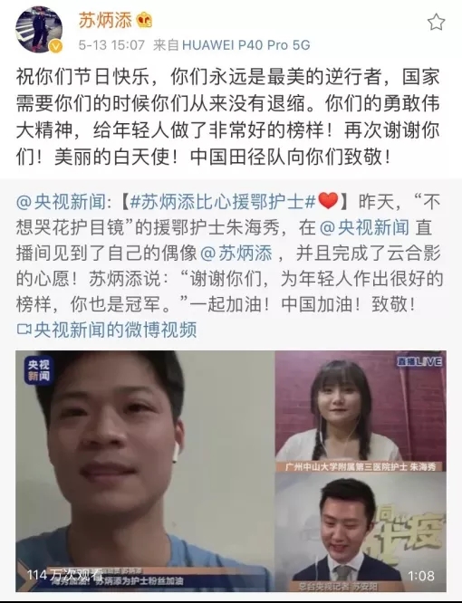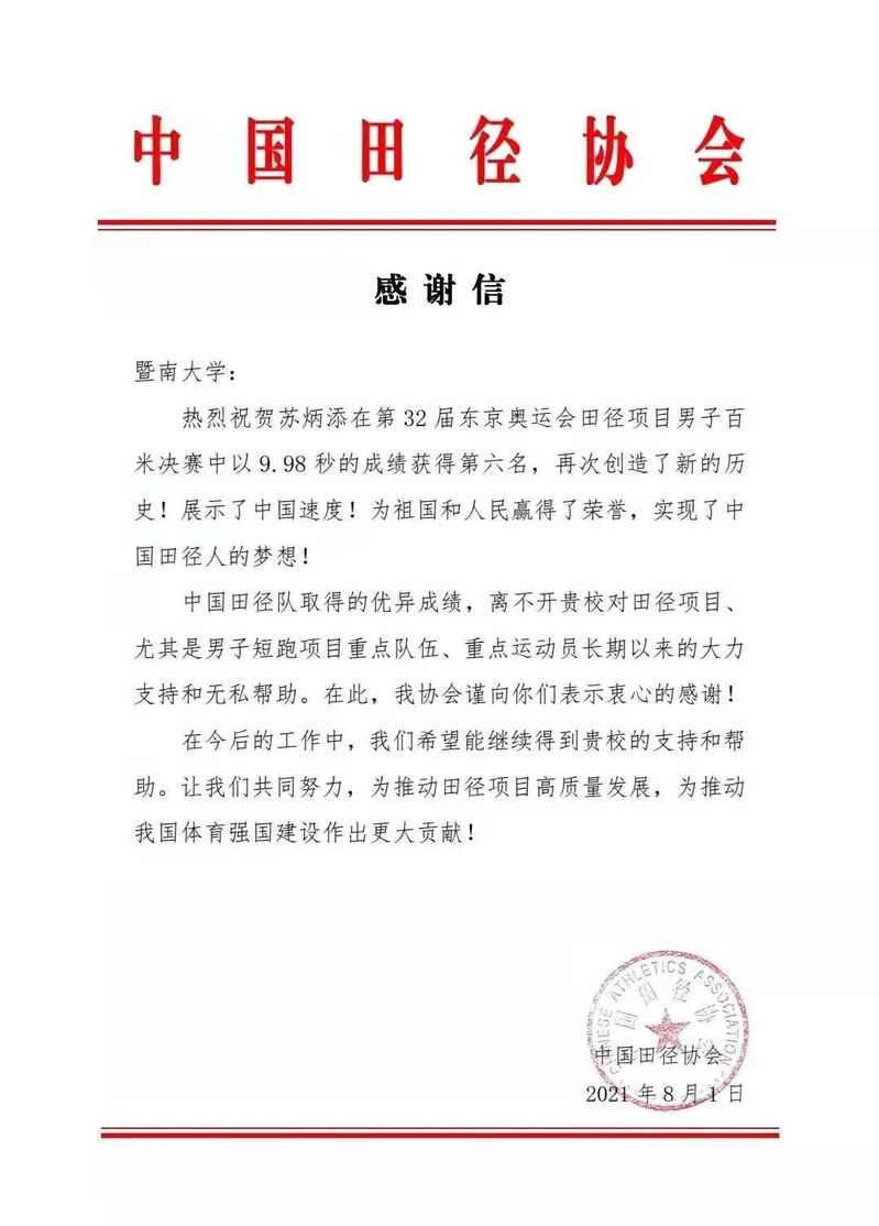 苏老师不断突破自我、打破人的极限和标准,再一次创造了亚洲历史新纪录,成为首位闯入奥运男子百米决赛的亚洲人。我深知此战不易,对此我无比敬佩!祝贺苏老师、祝贺暨南园!