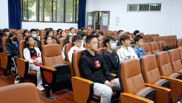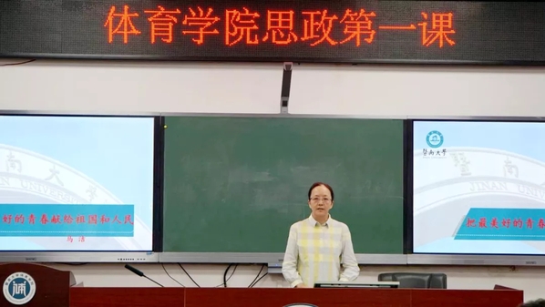 10月25日,暨南大学体育学院党总支马洁书记在邵逸夫体育馆电教室为2021级本科新生讲授“思政第一课”,题为“把最美好的青春献给祖国和人民”。