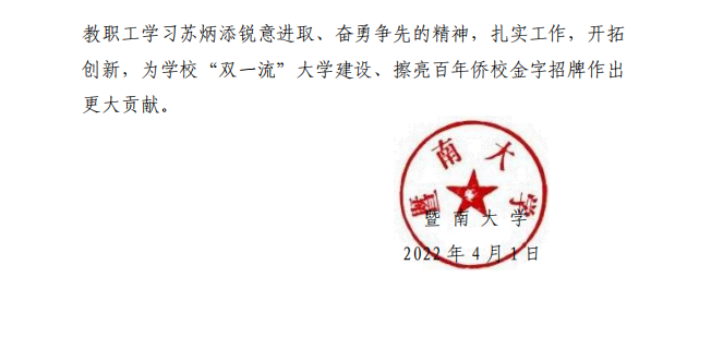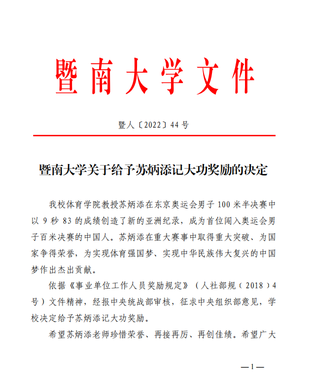 暨南大学给予苏炳添教授记大功奖励